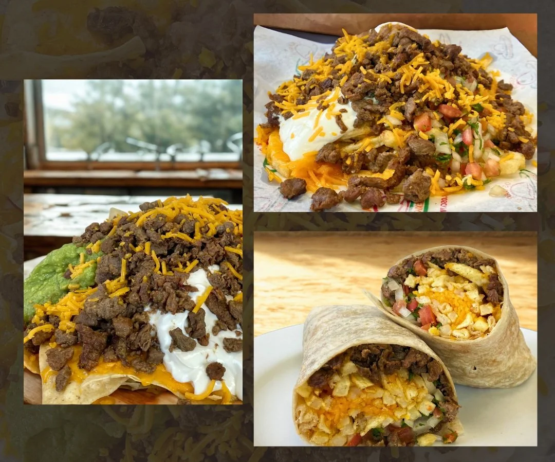 Seasoned carne asada, soft fries, fresh pico de gallo, creamy guacamole, and smooth sour cream — all rolled into a warm flour tortilla. A local must-have with every bite.